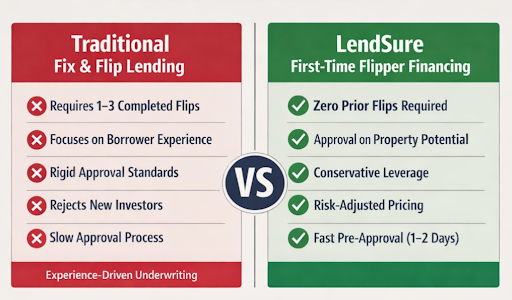 Traditional lenders typically require proof of 1-3 completed flips before extending financing. LendSure’s first-time flipper programs eliminate this barrier through adjusted risk pricing and conservative leverage ratios rather than experience requirements.