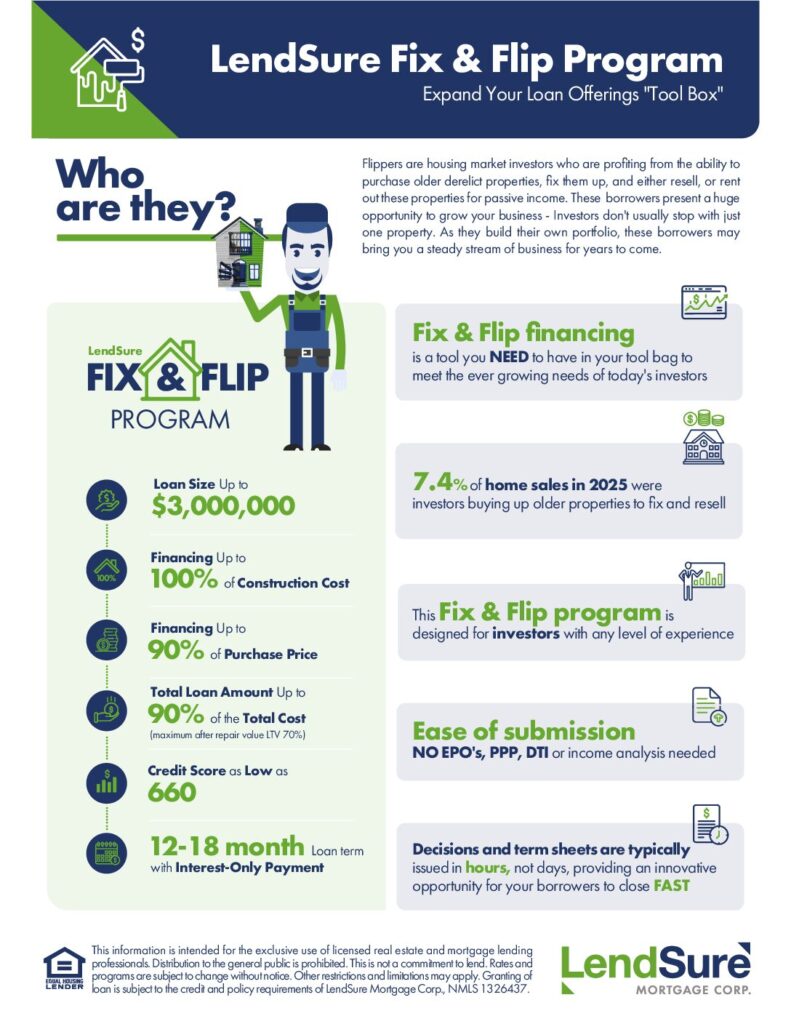 The real estate market is buzzing, and investors across America are seeing some amazing returns on turning their capital investment into fix and flip projects. To capitalize on this, they need quick and flexible financing. LendSure’s Fix and Flip financing makes it easy for your clients to buy, renovate, and sell properties fast.
